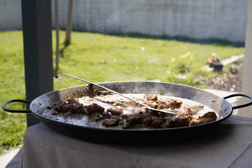 Er gibt uns mehr Kontrolle über das Feuer und einen besseren Servicerhythmus. Wenn du keinen hast, bringen wir eigenes Equipment, Paella-Pfannen und Glut für Vorspeisen mit.