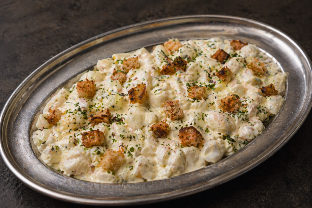 Gekocht, aromatisiert und umhüllt von hausgemachter cremiger Mayonnaise.
