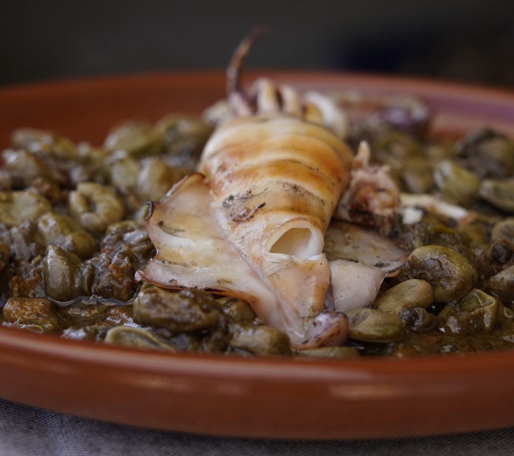Unter dem rauchigen Tintenfisch vom Grill verbirgt sich ein Schmortopf aus Panceta, Blutwurst und Favabohnen, der zu unserem Star-Vorspeisenteller geworden ist.