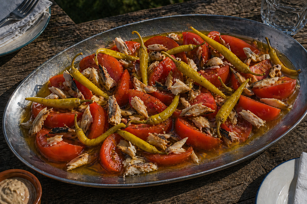Capellán, gesalzener und getrockneter Blauer Wittling, über Orangenholz geflammt, mit frischen Gartentomaten und mild eingelegten grünen Chilis.