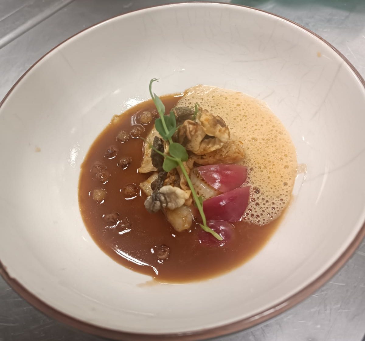Schonend gegart, mit Escabeche-Schaum und Thymian.