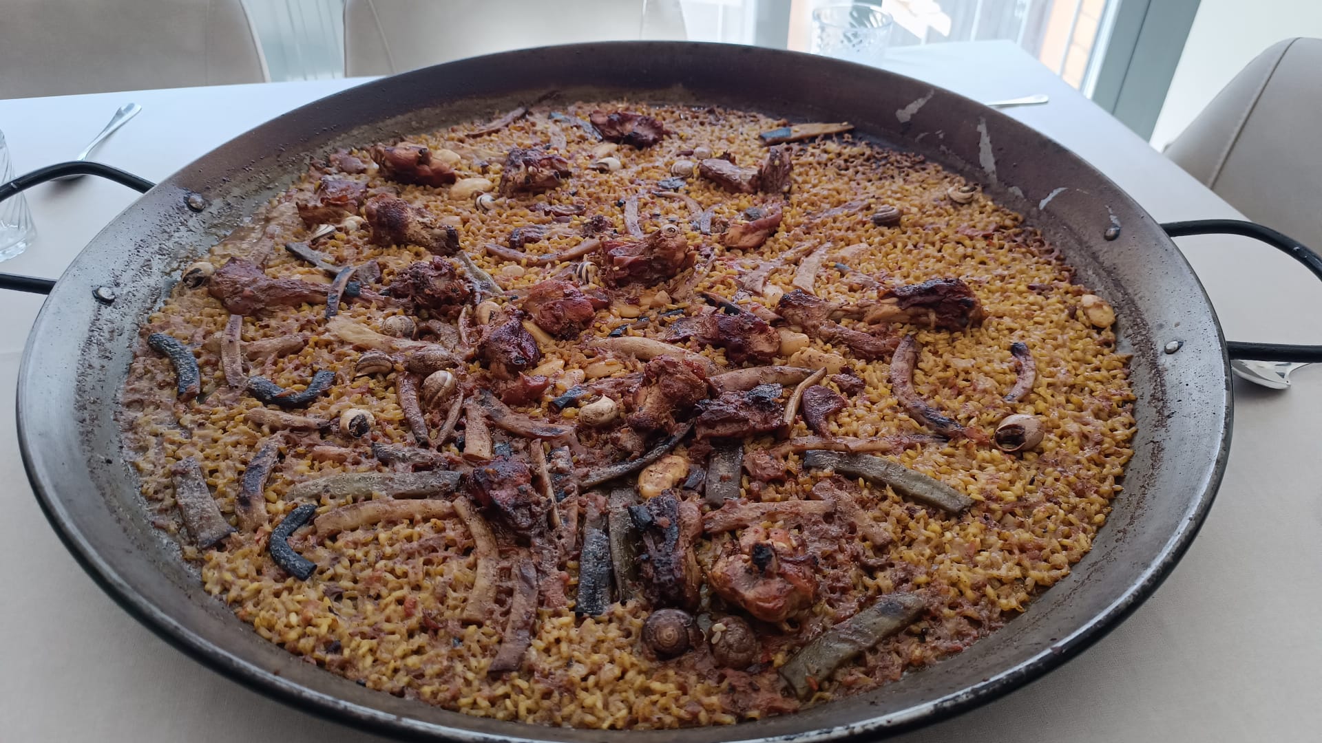 Arroz variedad J. Sendra, pollo, conejo, costilla de cerdo, caracoles, judía verde, alcachofa y garrafón.