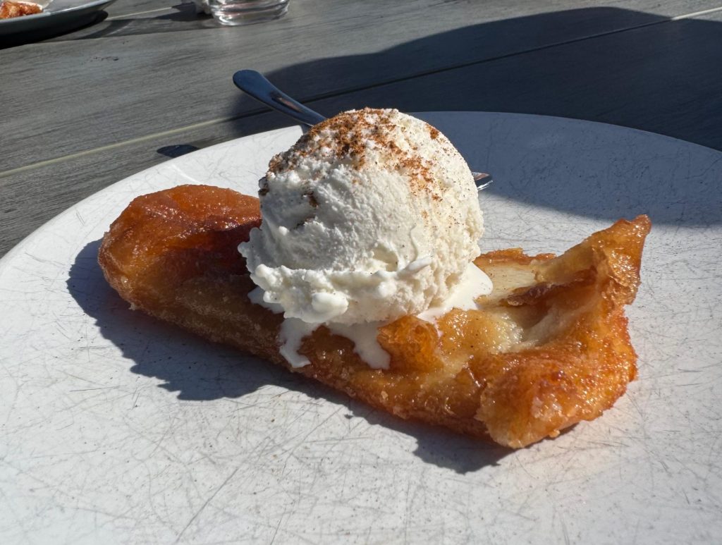 In Erdmandelmilch getränkt und frisch im Moment zubereitet. Mit einer Kugel Milchbaiser-Eis, um den Kontrast zwischen kalt und warm zu genießen.
